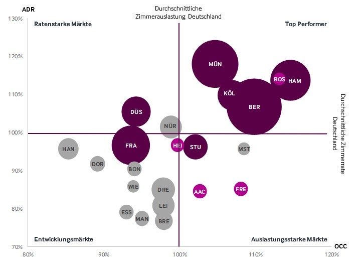 Die „Top Performer“ waren eindeutig die A-Städte Berlin, München, Hamburg und Köln sowie die seit einigen Jahren stark performende Hansestadt Rostock. Diese Destinationen lagen sowohl bei der Zimmerauslastung als auch beim durchschnittlichen Nettozimmerpreis über dem deutschen Durchschnitt.