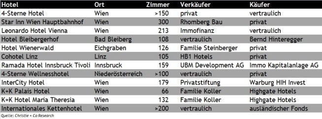 Wie in den Jahren zuvor war in der Hauptstadt Wien die meiste Bewegung zu spüren. Als Beispiel nennt Hochedlinger die Akquisition des Wombats Naschmarkt (130 Zimmer) in Wien durch einen russischen Investor. Im zweiten Quartal verkaufte außerdem die Immofinanz das Leonardo Hotel Vienna (213 Zimmer) direkt an den Pächter, das InterCity Hotel mit 179 Zimmern wurde von einer Privatstiftung an die Investmentfirma Warburg HIH Invest veräußert. Die größte Einzeltransaktion des Jahres fand am Jahresende statt, als ein internationales Kettenhotel mit über 200 Zimmern von einem ausländischen Fonds erworben wurde. Hierbei zeichnete Christie & Co im Auftrag des Eigentümers für den Verkauf verantwortlich.