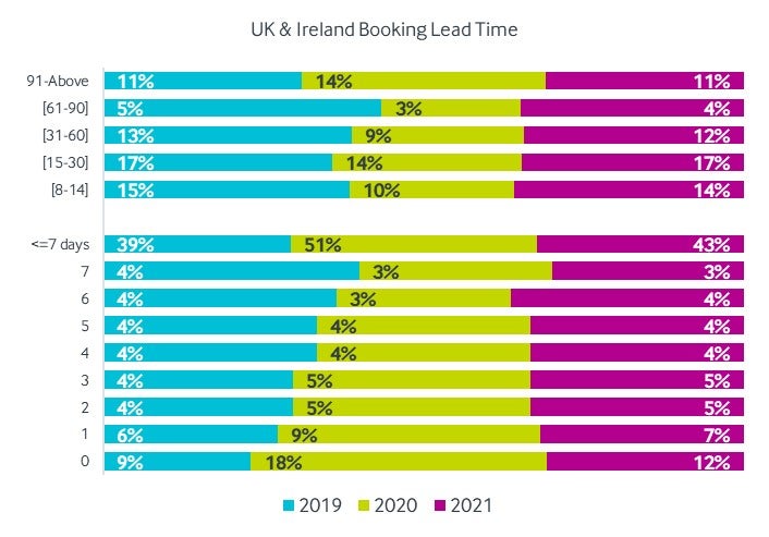 According to the latest report from Amadeus[1], at the peak of the pandemic in April 2020, 62% of all bookings worldwide were made less than 7 days before departure. The short booking window made staff scheduling, revenue management and on-site operational planning extremely difficult. While lead times have slowly improved with the return of travel from mid-2020, as of December 2021 the lead times for 44% of bookings remains below 7 days.