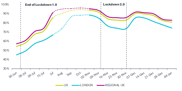 Regional UK hotels, specifically in leisure destinations, followed a more accelerated trend in reopening across the UK due to demand from leisure holidaymakers. October marked the peak with 94% of total room supply trading. The capital remained 6 ppts below the national level with international and corporate demand absent from the market.